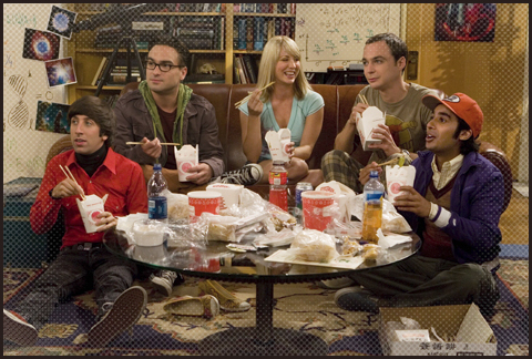 画像右からラージ、シェルドン、ペニー、レナード、ハワード